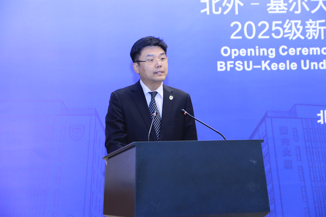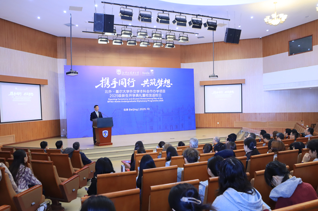在致辞中,赵刚祝贺项目2025级新生,并对访问北外的基尔大学代表团和回到母校的项目校友表示欢迎。他回顾了合作办学项目的发展历程,自2018年招生以来,该项目已累计招收384位学生。他特别肯定了同学们在校期间的优异成绩以及毕业后的职业发展状况,并勉励项目新生勇于拓展自我边界,充分利用中英两种教育体系的优势,努力成长为具有“家国情怀、全球视野、专业本领”的新型复合型人才。
