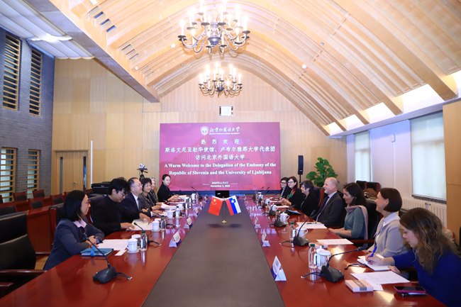 贾文键热烈欢迎代表团的来访,对斯洛文尼亚驻华使馆和卢布尔雅那大学的长期支持表示感谢,并介绍了北外的各方面情况。他表示,北外矢志不渝开展语言教育,推动人文交流,加强真诚对话,北外与斯洛文尼亚教育、文化等各界机构的友好合作见证了两国友好关系的发展,愿意与卢布尔雅那大学在已有坚实基础上落地跨学科联合培养及研究项目。