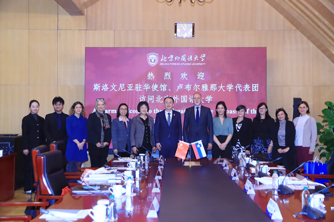 斯洛文尼亚驻华大使馆法务、新闻及文化领事白蕊莎(Zarja Bregant),卢布尔雅那大学哲学院院长莫伊察·沙伦贝格(Mojca Schlamberger Brezar)、副院长莫伊察·斯莫雷(Mojca Smolej)、对外斯洛文尼亚语中心海外高校斯语项目主任莫伊察·尼多夫尔(Mojca Nidorfer)、哲学院国际交流办公室主任阿妮亚·戈莱茨(Anja Golec),北外欧洲语言文化学院院长柯静、国际交流与合作处副处长龚婧、斯洛文尼亚语教研室主任王雨辰、外籍专家梅特卡·洛卡尔(Metka Lokar)等参加会见。