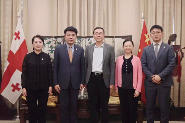 10月30日中午,代表团拜访中国驻格鲁吉亚大使馆,周谦大使会见代表团。赵刚介绍了北外最新的发展情况,尤其是格鲁吉亚语专业人才培养以及与格鲁吉亚方面的合作情况。周谦作为北外校友,高度评价北外在推动中格各领域交流中的贡献,表示将全力支持北外格语专业建设及人才培养,为密切中格交流携手努力。