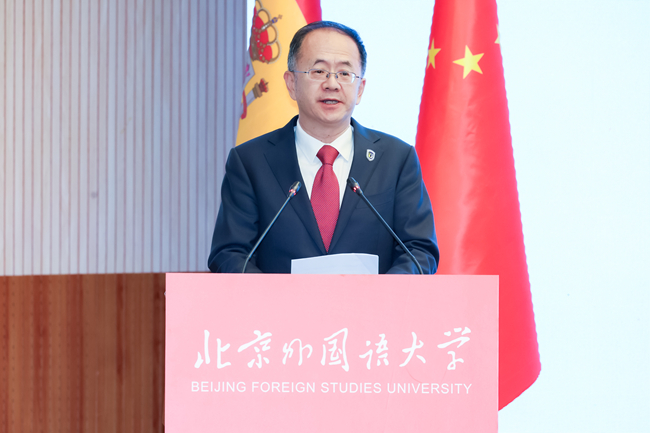 贾文键在致辞中回顾了北外西班牙语专业73年的发展历程,感谢莱蒂西娅充分肯定北外为长期推动西班牙语言文化教学与研究、中西两国民心相通作出的贡献。他强调,文明的对话离不开教育的土壤,外语教育的意义不仅在传授知识,更在涵养各美其美、美美与共的博大胸怀。北外愿继续深化与西班牙在教育文化等各领域的务实合作,为中西全面战略伙伴关系注入新的动力。