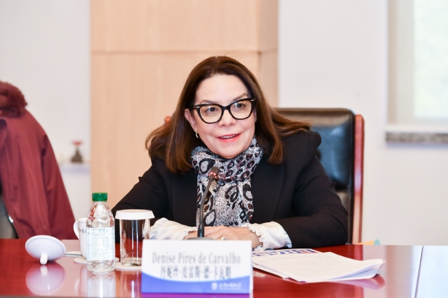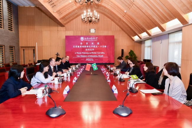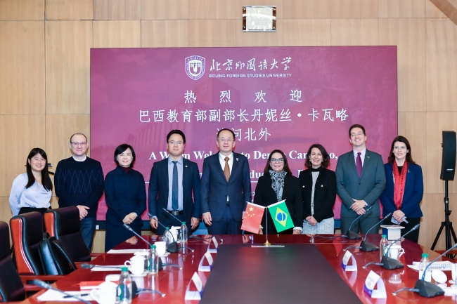 11月17日,巴西教育部副部长、巴西高等教育人员促进会(CAPES)主席丹妮丝·皮雷斯·德·卡瓦略访问北京外国语大学。北外党委书记王定华,党委副书记、校长贾文键,党委常委、副校长赵刚会见卡瓦略一行。