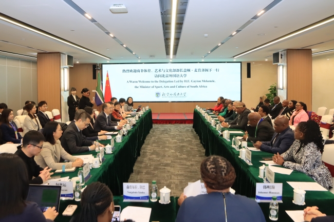12月3日,南非体育、艺术和文化部部长盖顿·麦肯齐率代表团访问北京外国语大学。北外校长、党委副书记贾文键,党委常委、副校长刘欣路会见代表团一行。