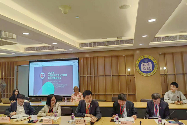在2025年中英高等教育人文联盟执行理事会会议中,赵刚与其他联盟院校代表共同讨论了如何加强联盟院校交流,深化教学科研和出版合作等议题。在“审议承办2027年度会议提请”环节,执行理事会一致同意北京外国语大学主办2027年中英高等教育人文联盟年度论坛。