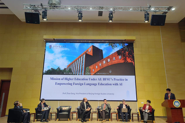 在特邀教育论坛环节,赵刚作了题为“智能涌现与使命重塑:人工智能赋能外语教育的北外实践”的演讲,介绍了北外近年来的办学成就与全球教育合作网络,阐述了北外如何更好地借助数智化赋能,实现教学方式深刻变革,推动人工智能与多语种教学的深度融合。他重点介绍了北外人工智能与人类语言重点实验室、中国高校外语慕课联盟、“外晓通”中枢性赋能、全球语言服务平台等北外在数智化建设领域的新成就。他表示,人工智能与教育融合的最终目的是“照亮人、成全人”,将致力于把北外打造成一个“更加人文、更加国际、更加智慧”的世界一流外国语大学,为全球外语教育的发展贡献力量。