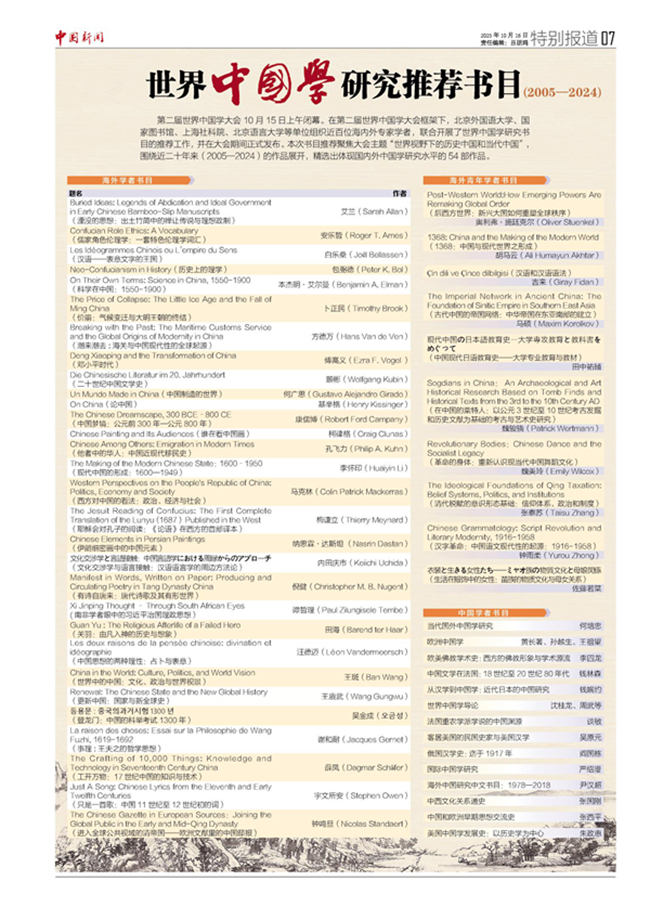 在10月15日举行的第二届世界中国学大会·上海论坛闭幕式上发布了《世界中国学研究推荐书目》。本次书目推荐聚焦大会主题“世界视野下的历史中国和当代中国”,围绕近二十年来(2005—2024)的作品展开,精选出体现国内外中国学研究水平的54部作品。其中,海外学者作品共40部(含海外80后的青年学者作品10部),国内学者作品14部,覆盖历史、哲学、文化、政治、经济、社会、语言等不同领域,以期为广大中外读者多维度地呈现中华文明和中国道路的文明内涵、经验启示和世界意义,帮助国际社会更好读懂中国的历史、现在与未来。